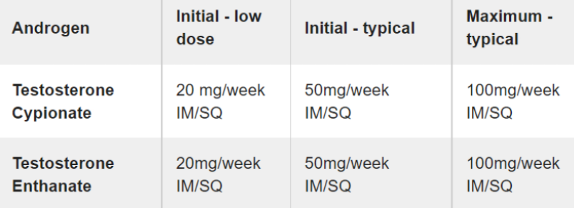 Here is a table of typical doses of testosterone used in transmasculine hormone therapy: