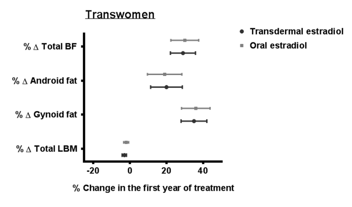 Sixty five transwomen using oral estrogens, 49 transwomen using transdermal estrogens, 41 transmen using T esters, 34 transmen using T gel and 30 transmen using T undecanoate were included. Crude analyses in transwomen showed a trend toward a larger change in some body fat outcomes in persons using oral estradiol compared with persons using transdermal estradiol, but after adjustment for BMI at the start and age, these differences disappeared (Supplementary Table 1).
